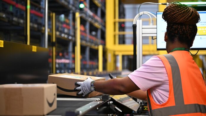 Amazon.com Inc. packages are seen on a conveyor belt with other small parcels. (Luke Sharrett/Bloomberg via Getty Images)